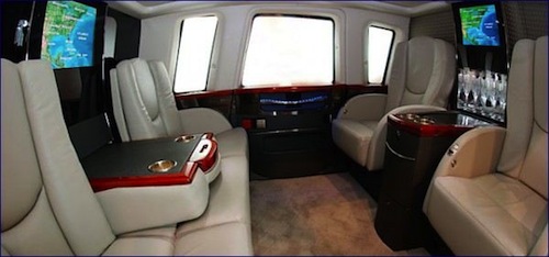 You wouldn’t think so by looking at the size of the leather seats pictured here, but when configured in a VIP arrangement, this chopper can still seat 8 passengers. Of course, with that capacity and with such luxurious materials (is that mahogany?), it will cost you a cool $14.5 million. So you’re going to need to win a pretty big lotto jackpot to arrord this one. As for performance, in this beauty you can cruise along at 193 mph for at least 573 miles.